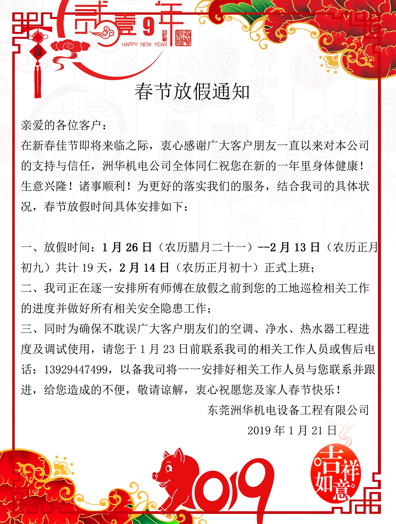 洲華機(jī)電2019春節(jié)放假通知